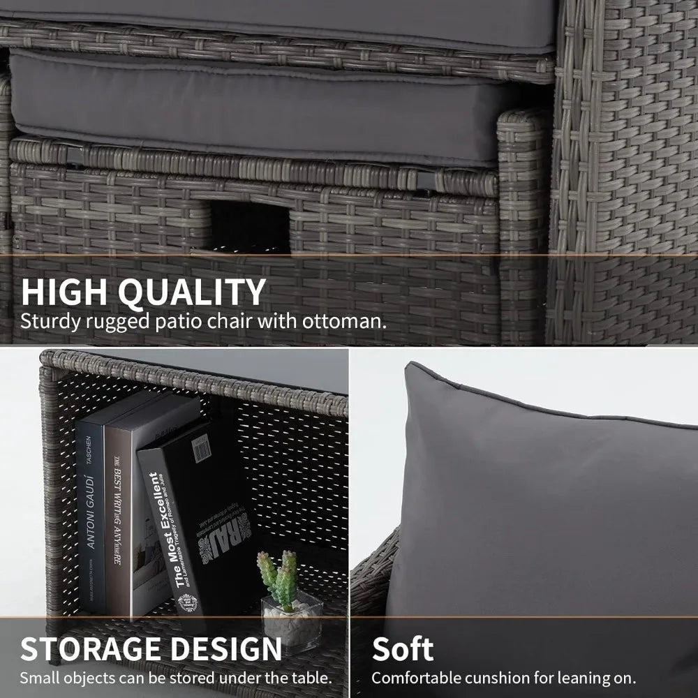 - 【Upgraded Practicality Table】The coffee table with tempered glass for added weight-bearing. There is also an open storage space for blankets, books, etc. The small space outdoor chair with ottoman set will add a touch of elegance to any patio and practical.