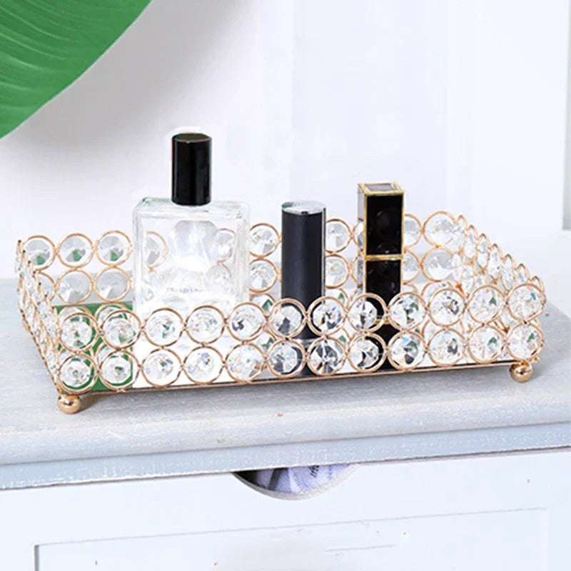 Golden Glass Mirror Tray Cosmetic Container Lipstick Necklace Desktop Shelf Storage Jewelry Metal Storage Box Crystal Plate Tray