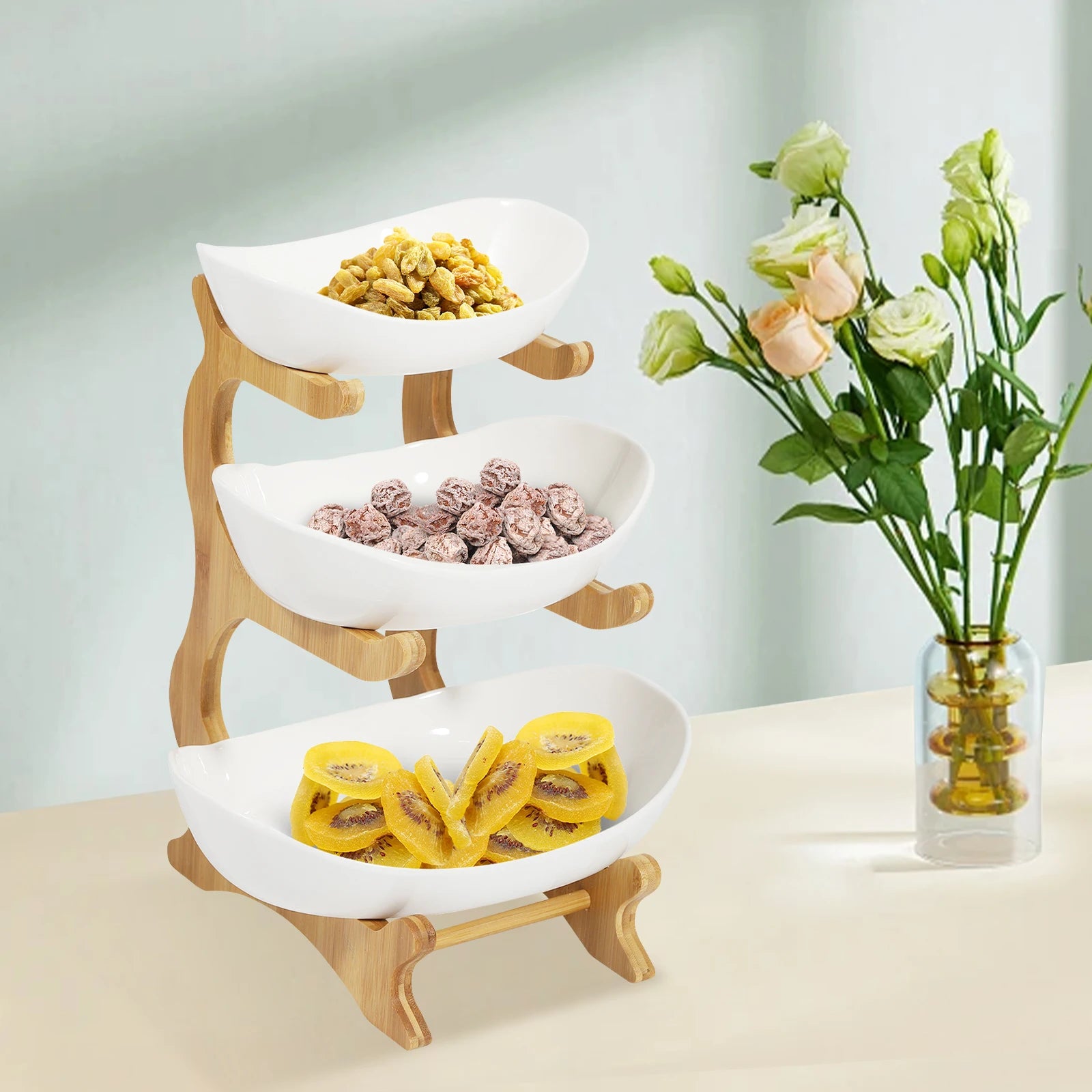 Designing every corner of your home with care is very fulfilling and satisfying. When you prepare various fruits and snacks to treat yourself, do you find that these scattered items make your home messy? Our 3-tier fruit bowl is the ideal answer to such questions! In addition to its basic function of storing various snacks and fruits, it is also a delicate decoration to integrate into your home decor! The elegant curve design and natural warm colors, combined with the unique vertical design, make it a balance for both practicality and aesthetics.