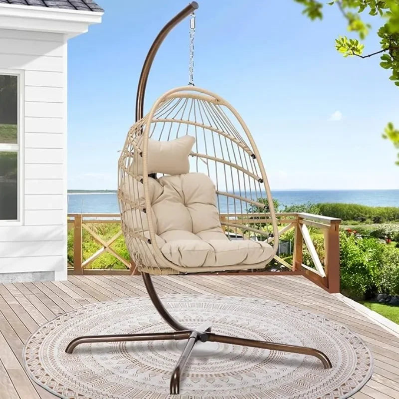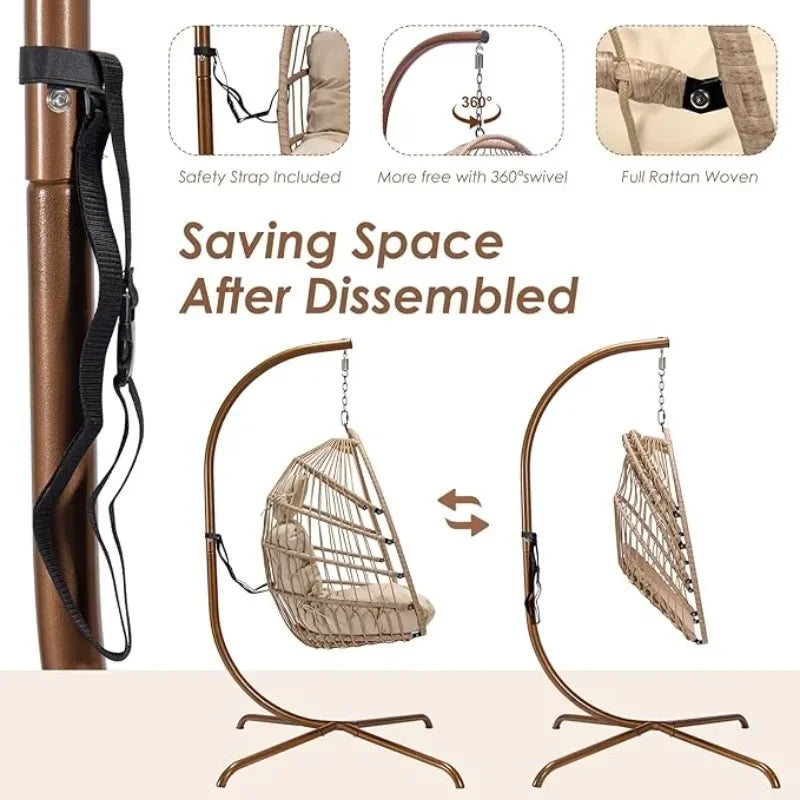 Hanging Chair with Stand Outdoor Swing Water Resistant Cushions Rattan Wicker Chair Foldable Basket