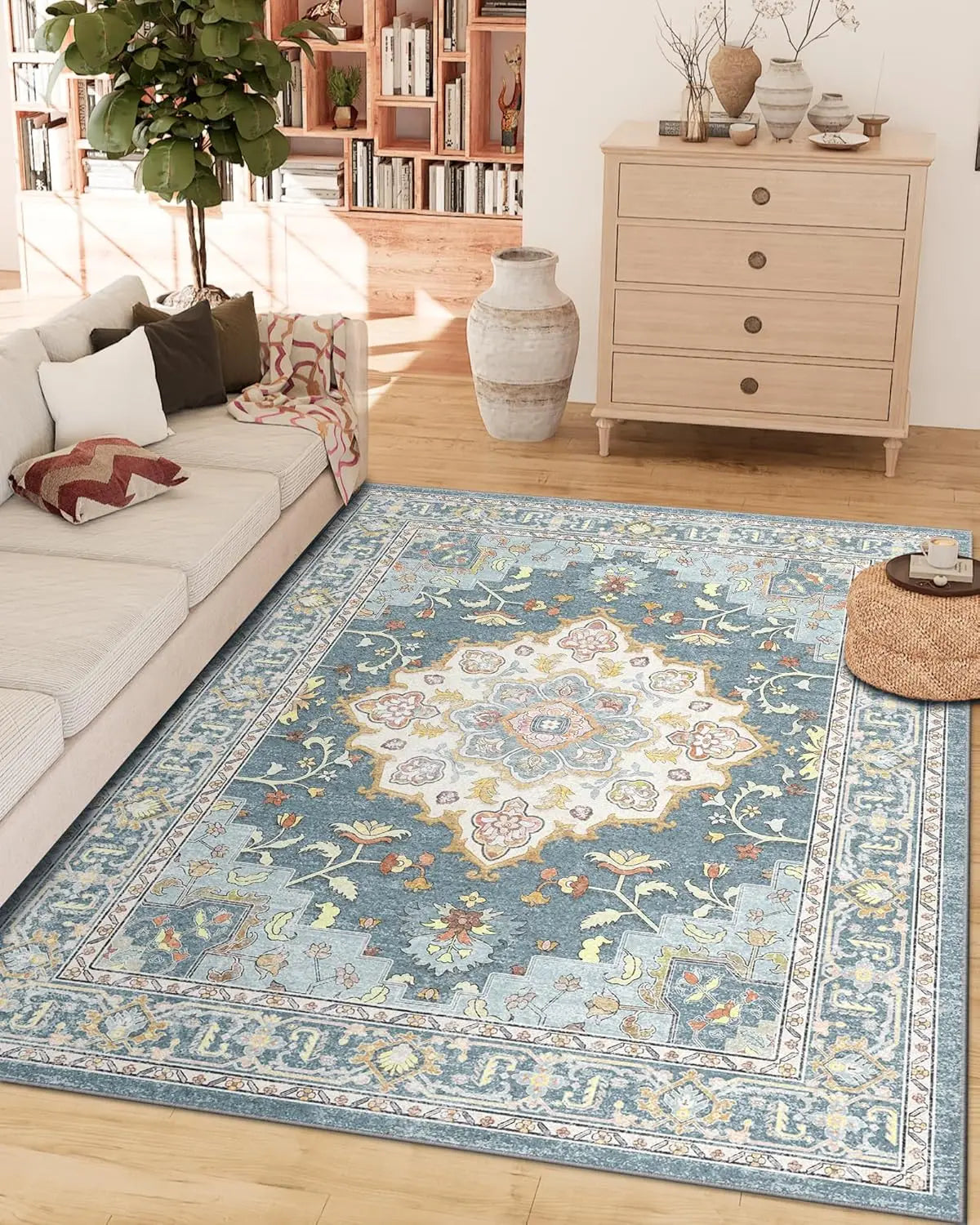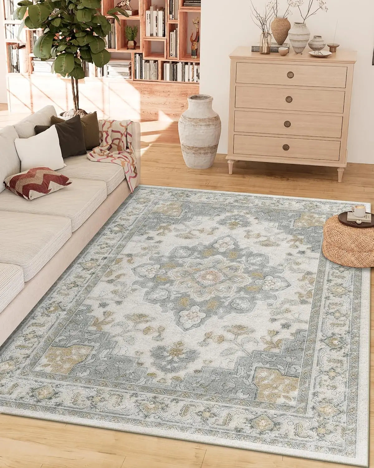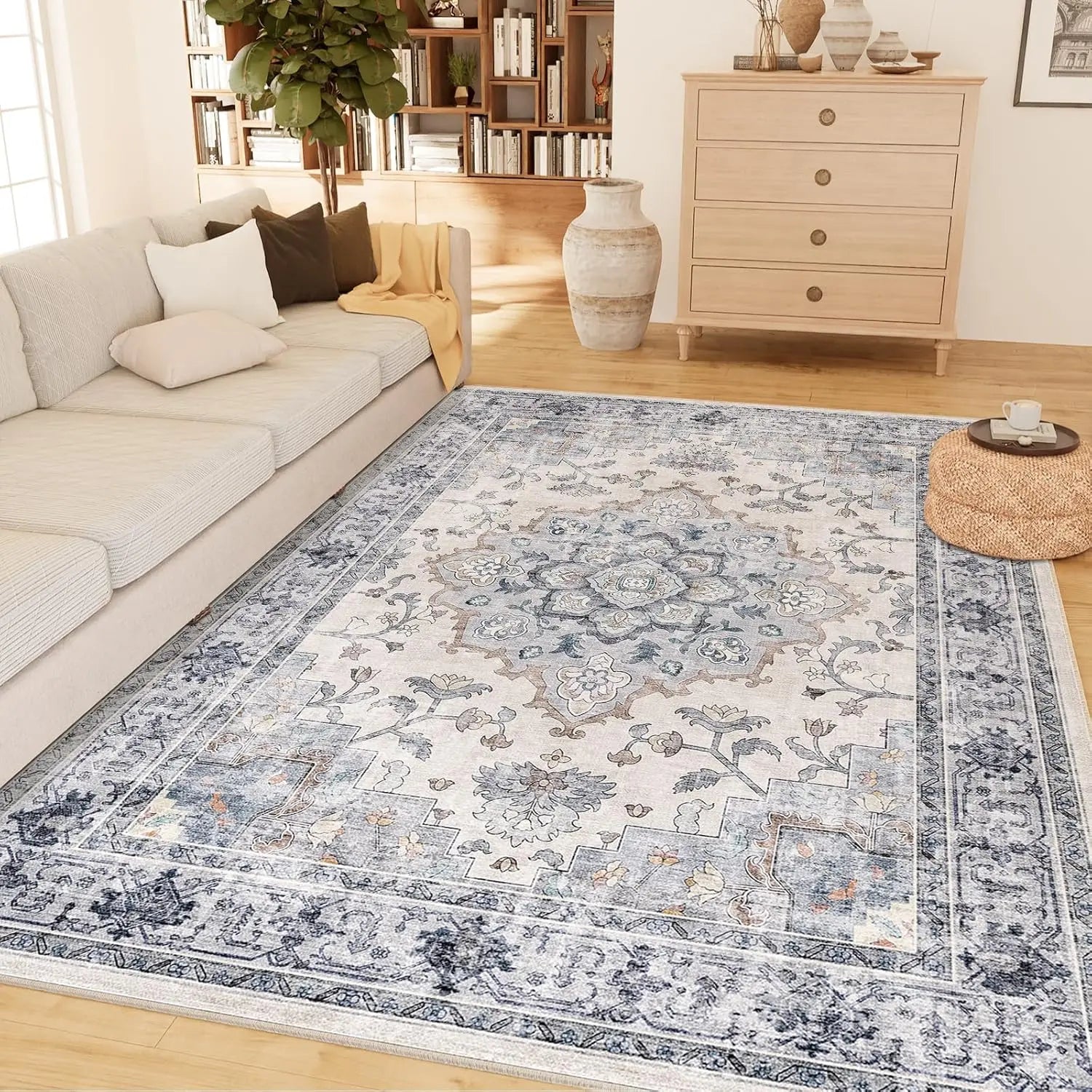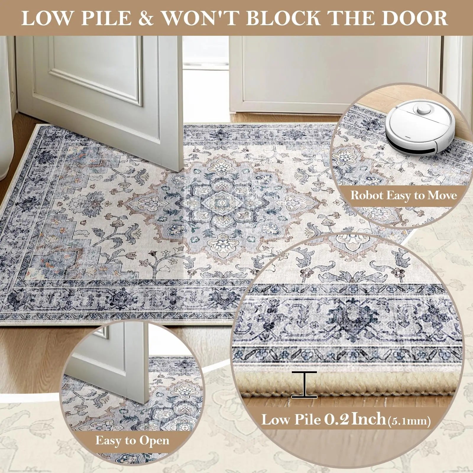 Machine Washable Area Rugs for Living Room Carpet Non Slip Low Pile Water Repellent Soft Print Pattern