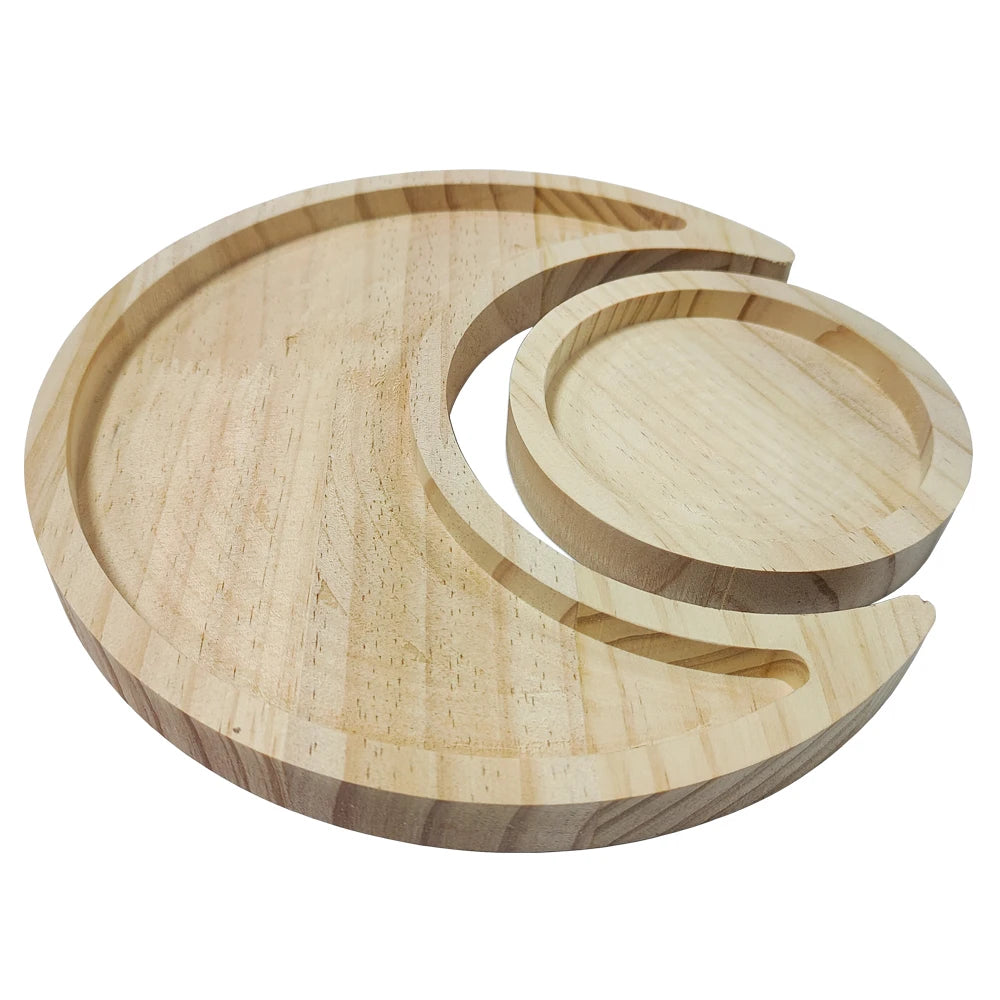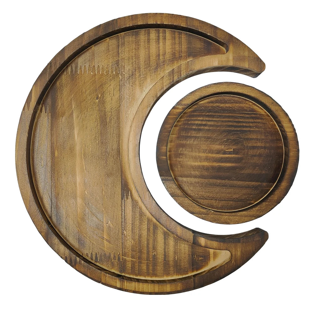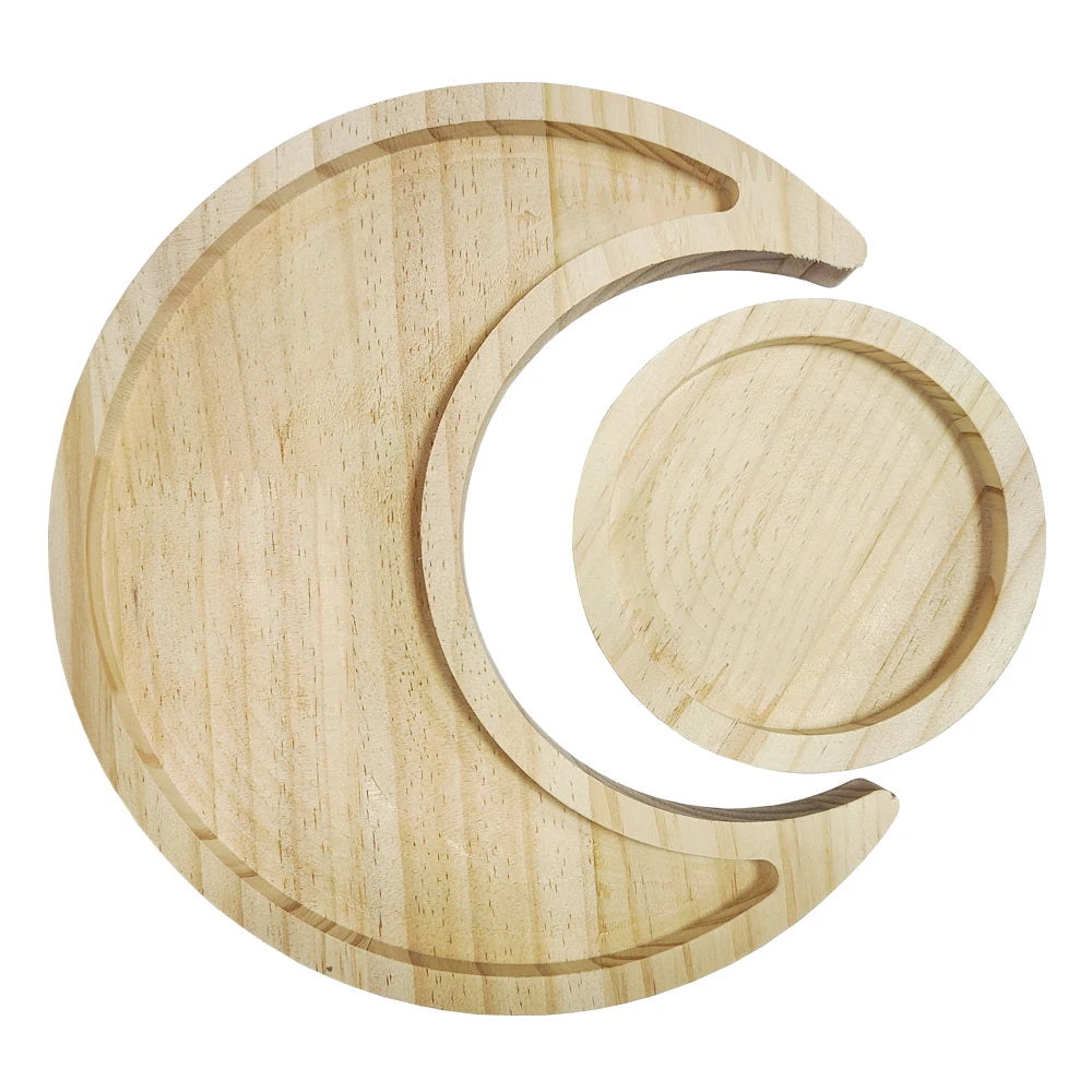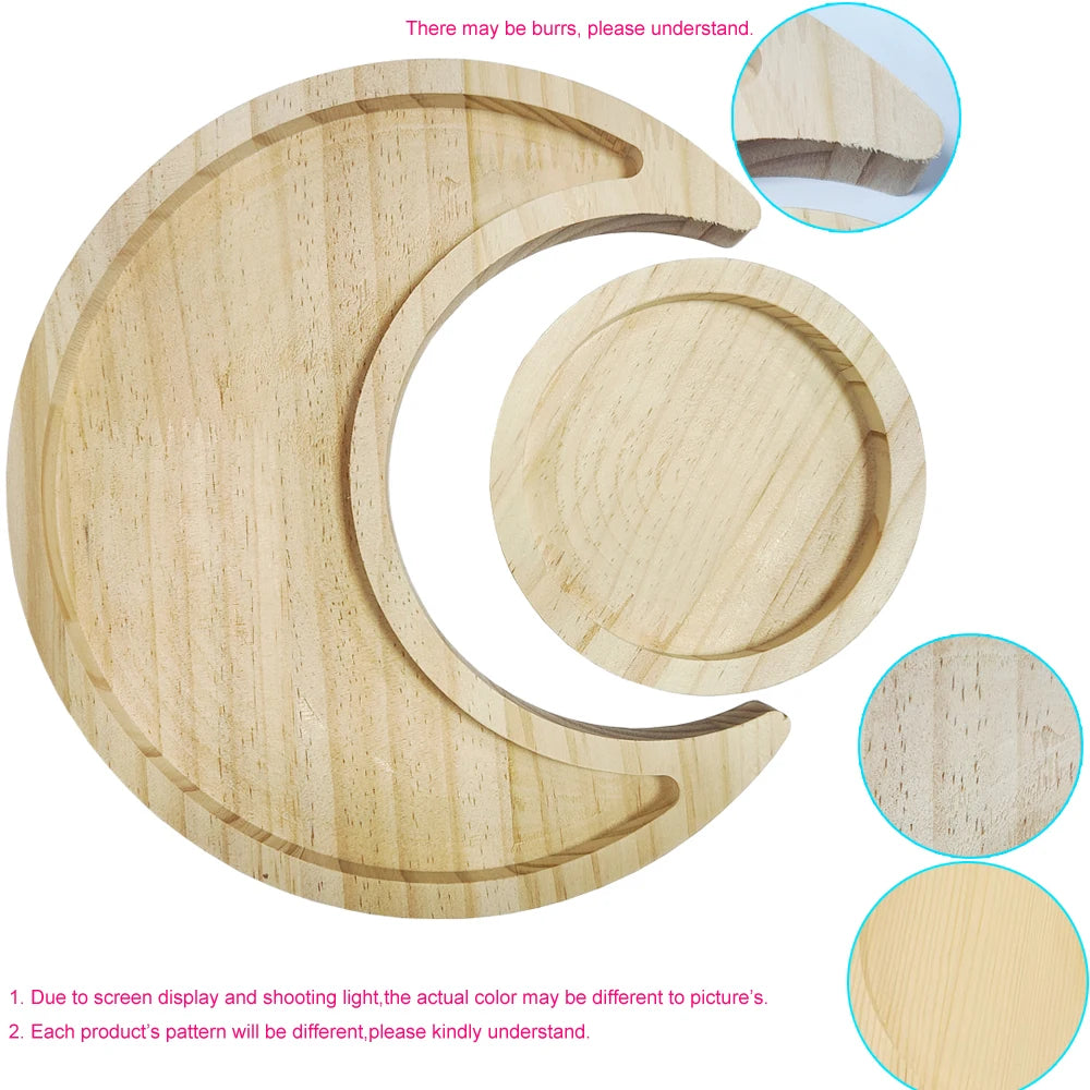 Wooden Crystal Holder Moon Tray with Round Dish Display Stones Crystals Essential Oil Jewelry Rings Storage Organizer Home Decor